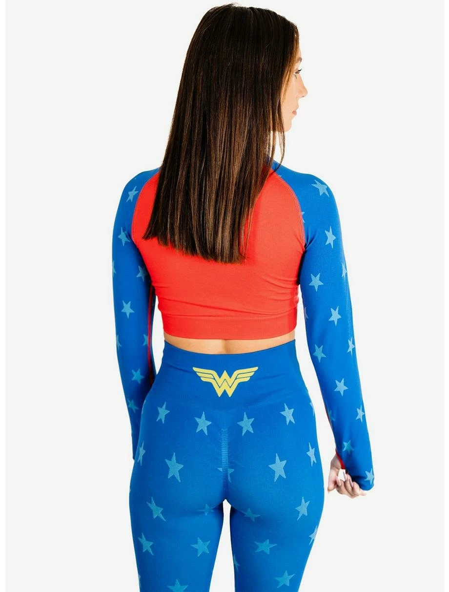 Embrace your inner superhero in this stylish Wonder Woman cosplay workout set! Join the strong and courageous Amazon warrior on her next mission as she fights for peace and teams up with other Justice League heroes like Batman, Superman, Flash, Green Lantern, and Aquaman to save the world. Wear the iconic Wonder Woman symbol proudly and enter the exciting world of DC Comics in your new seamless leggings and crop top designed to look like your favorite comic book character’s crime fighting costume.