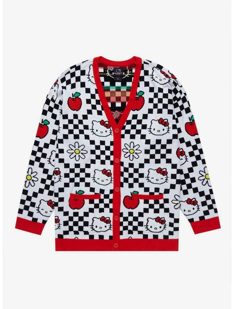 Bring some Sanrio style to your cozy looks with this Hello Kitty cardigan! This adorable garment features Hello Kitty, apples, and daisies, in an allover, checkered design.Â